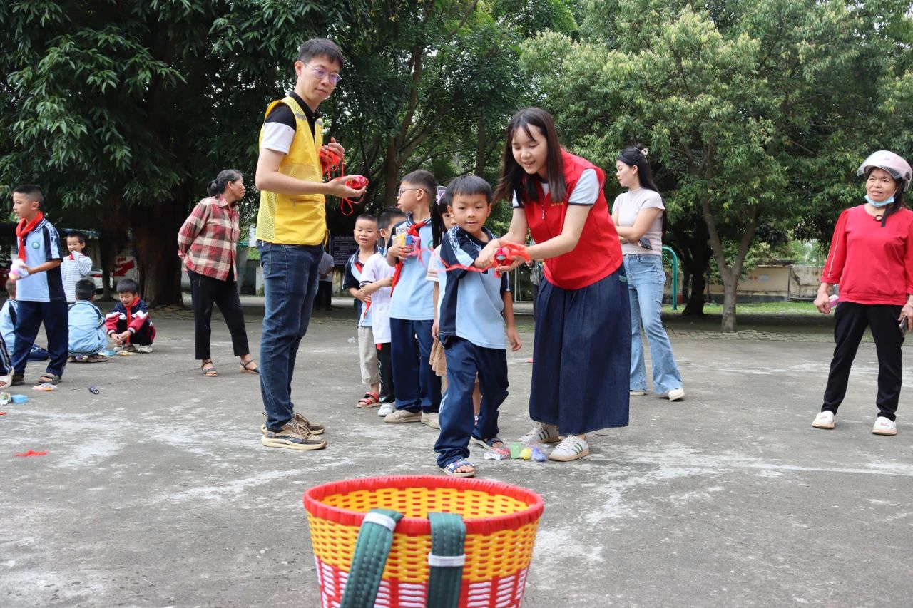 課堂結(jié)束后,在志愿者們的帶領(lǐng)下,孩子們來到教室外參與拋繡球、投壺、套圈等民族傳統(tǒng)體育項(xiàng)目。志愿者與孩子們分組協(xié)作、相互配合,完成了一項(xiàng)項(xiàng)挑戰(zhàn),激勵(lì)孩子們享受運(yùn)動的快樂,觀察到、感受到生活中的民族藝術(shù)的魅力,豐富了文化生活和情感體驗(yàn)。